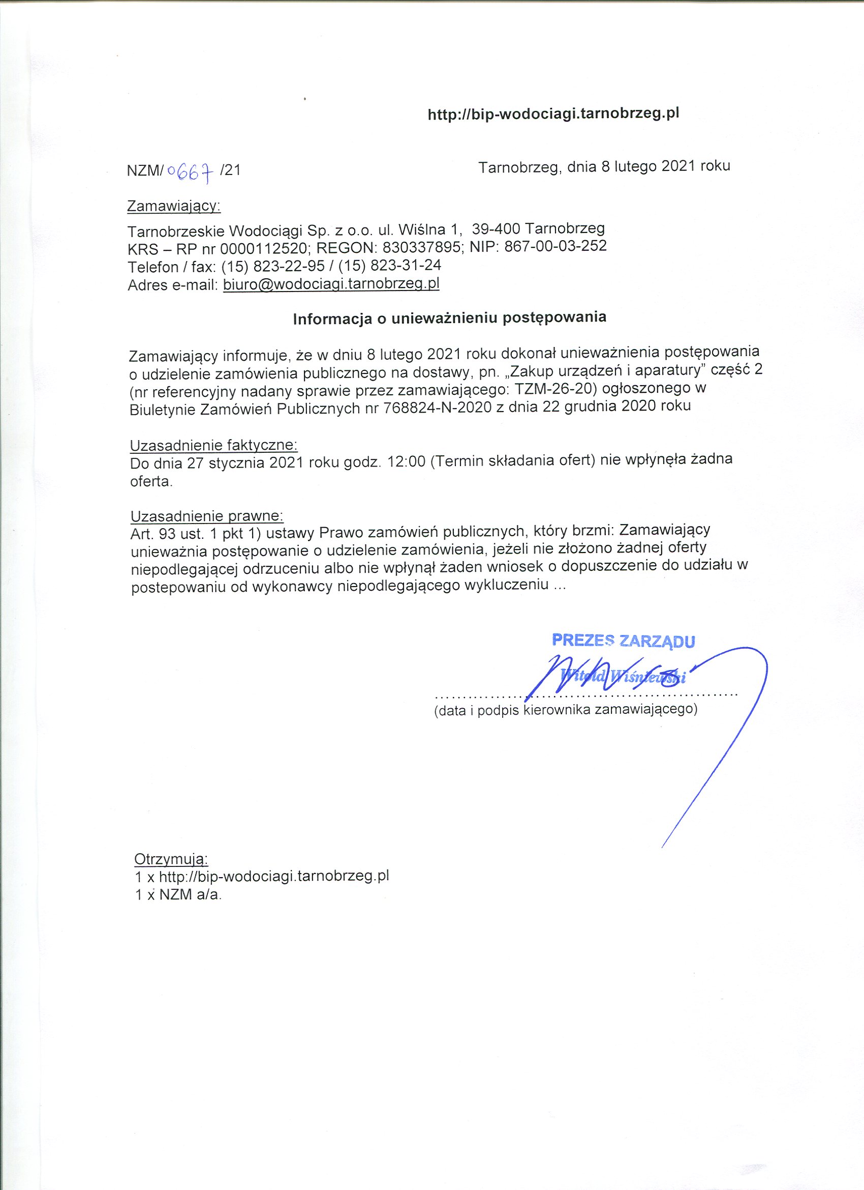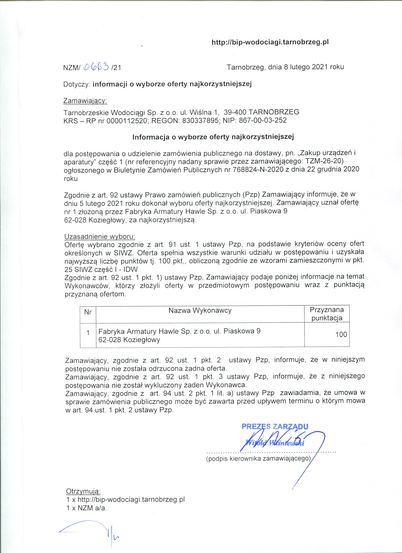 przetarg nieograniczony z dnia 21 grudnia 2020 roku na: TZM-26-20 Zakup urządzeń i aparatury do przesyłu wody