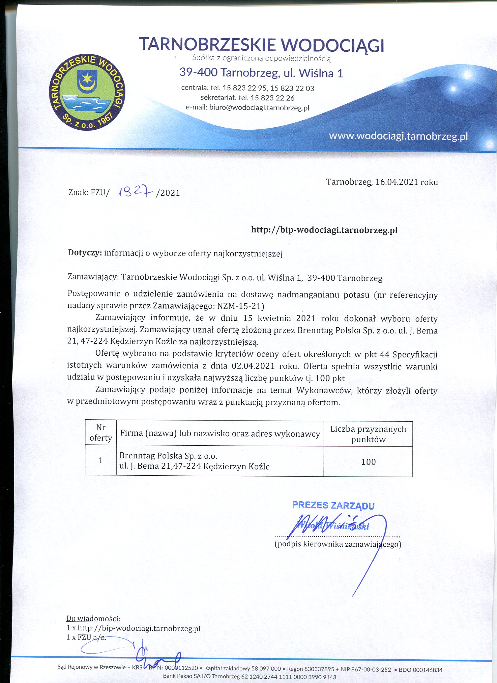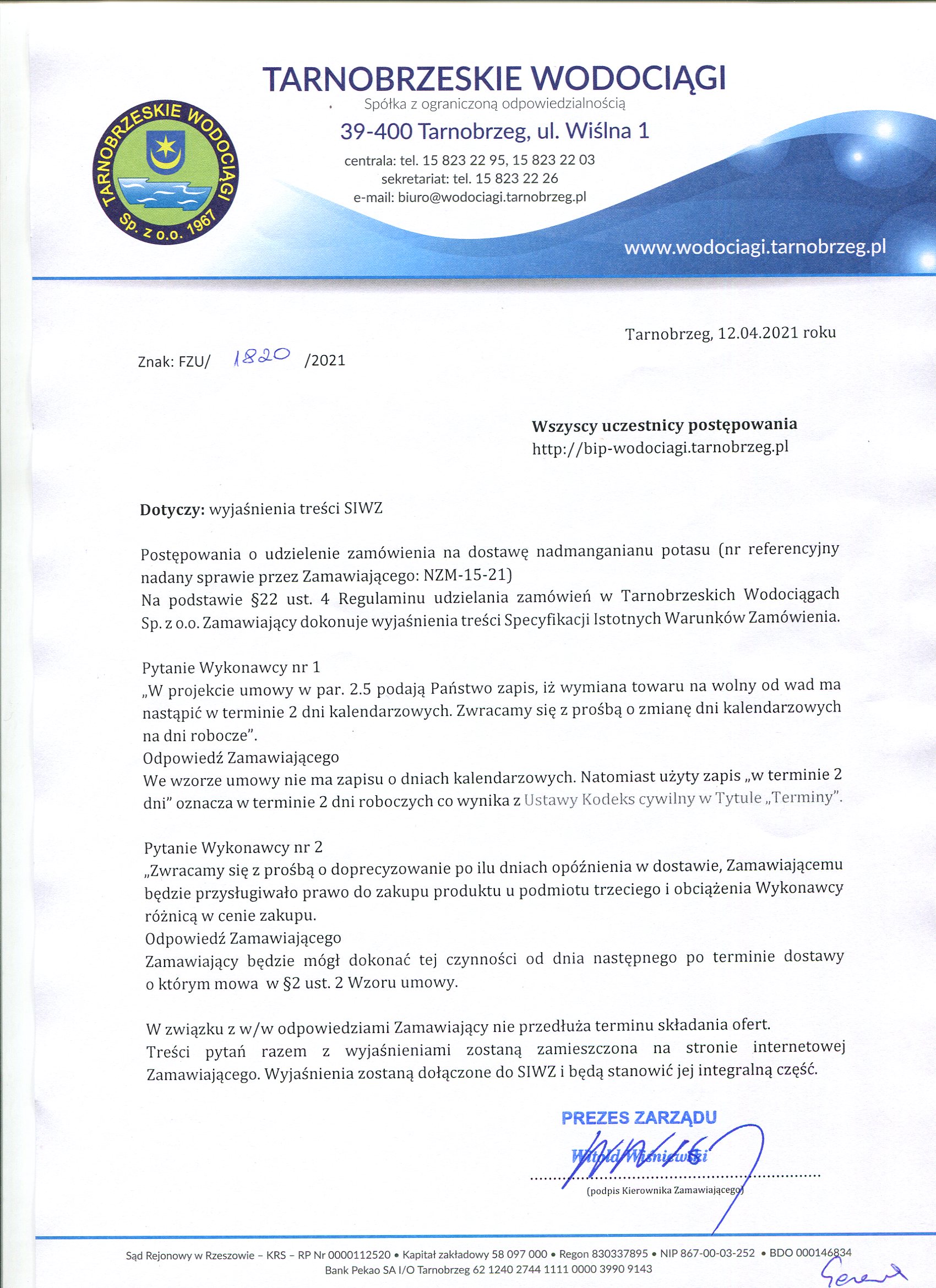 przetarg z dnia 6 kwietnia 2021 roku na: Dostawa nadmanganianu potasu