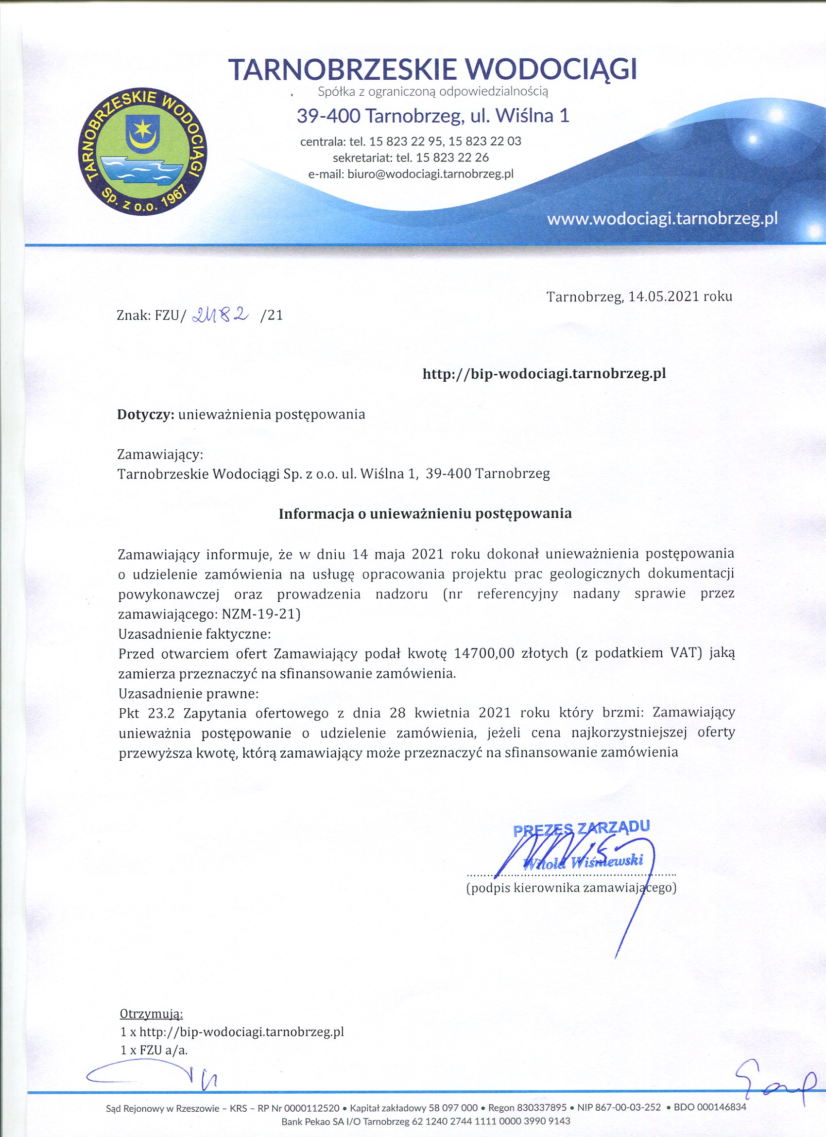 Zapytanie ofertowe z dnia 29 kwietnia 2021 roku na: Opracowanie projektu prac geologicznych, dokumentacji powykonawczej oraz prowadzenie nadzoru