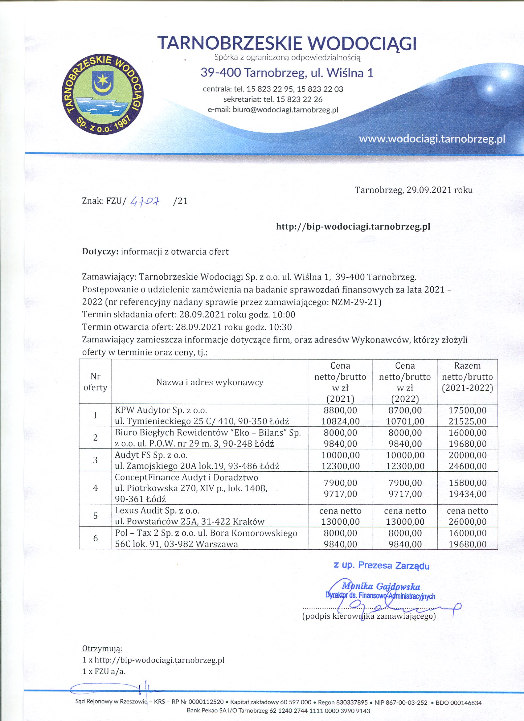 Zaproszenie do składania ofert z dnia 15 września 2021 roku na: Przeprowadzenie badań sprawozdań finansowych za lata obrotowe 2021 i 2022