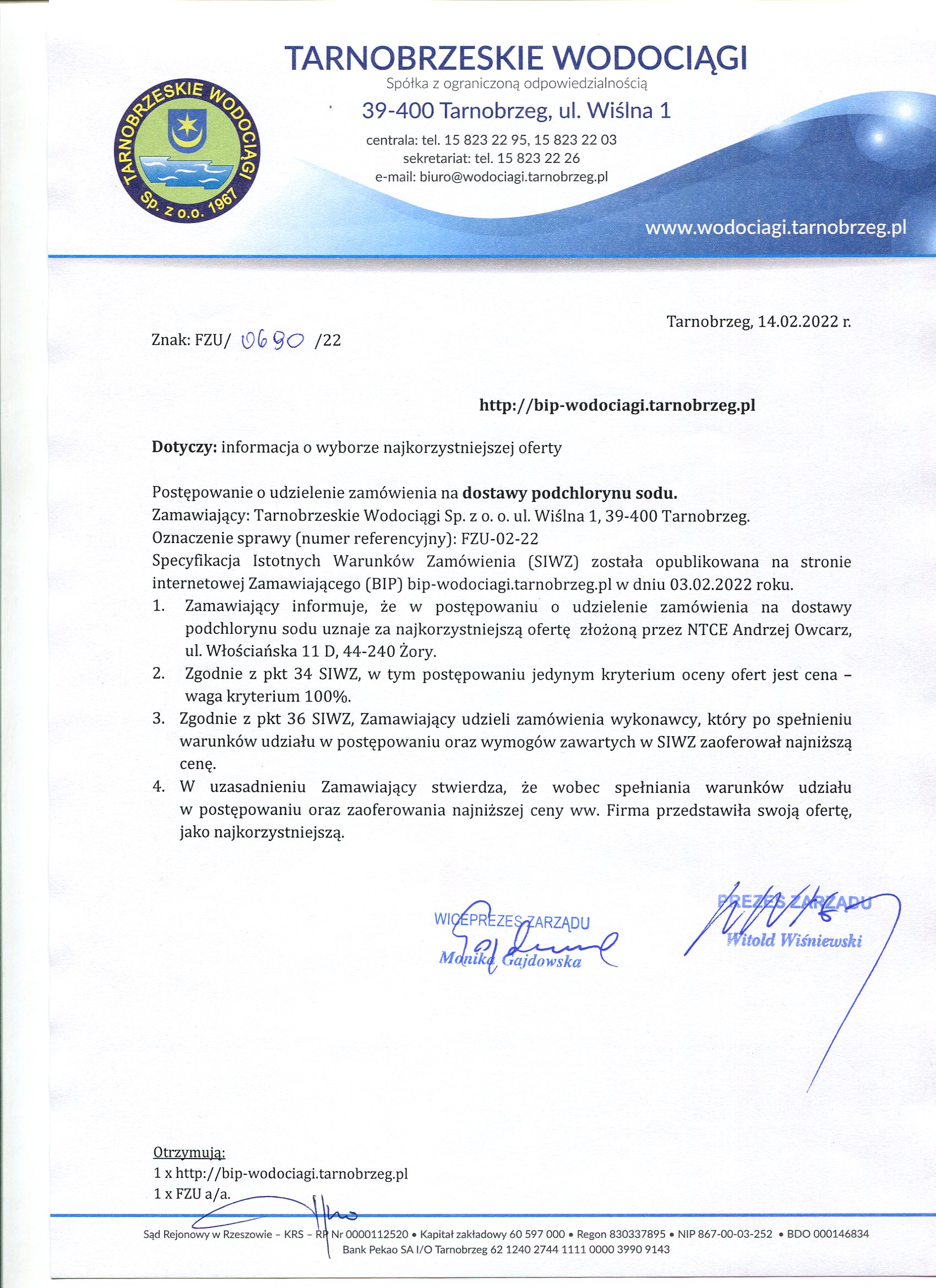 Przetarg z dnia 3 lutego 2022 roku na: Dostawa podchlorynu sodu