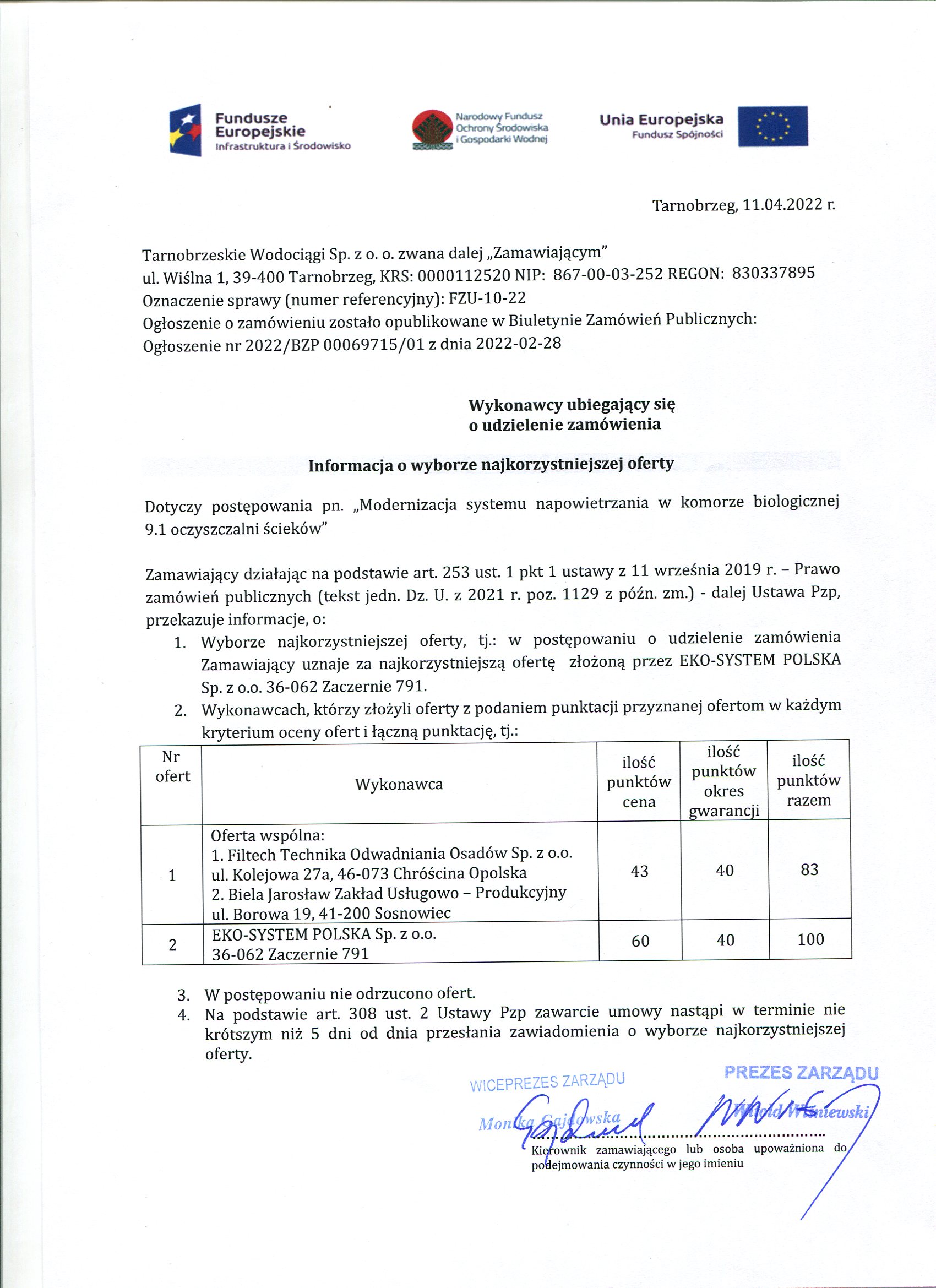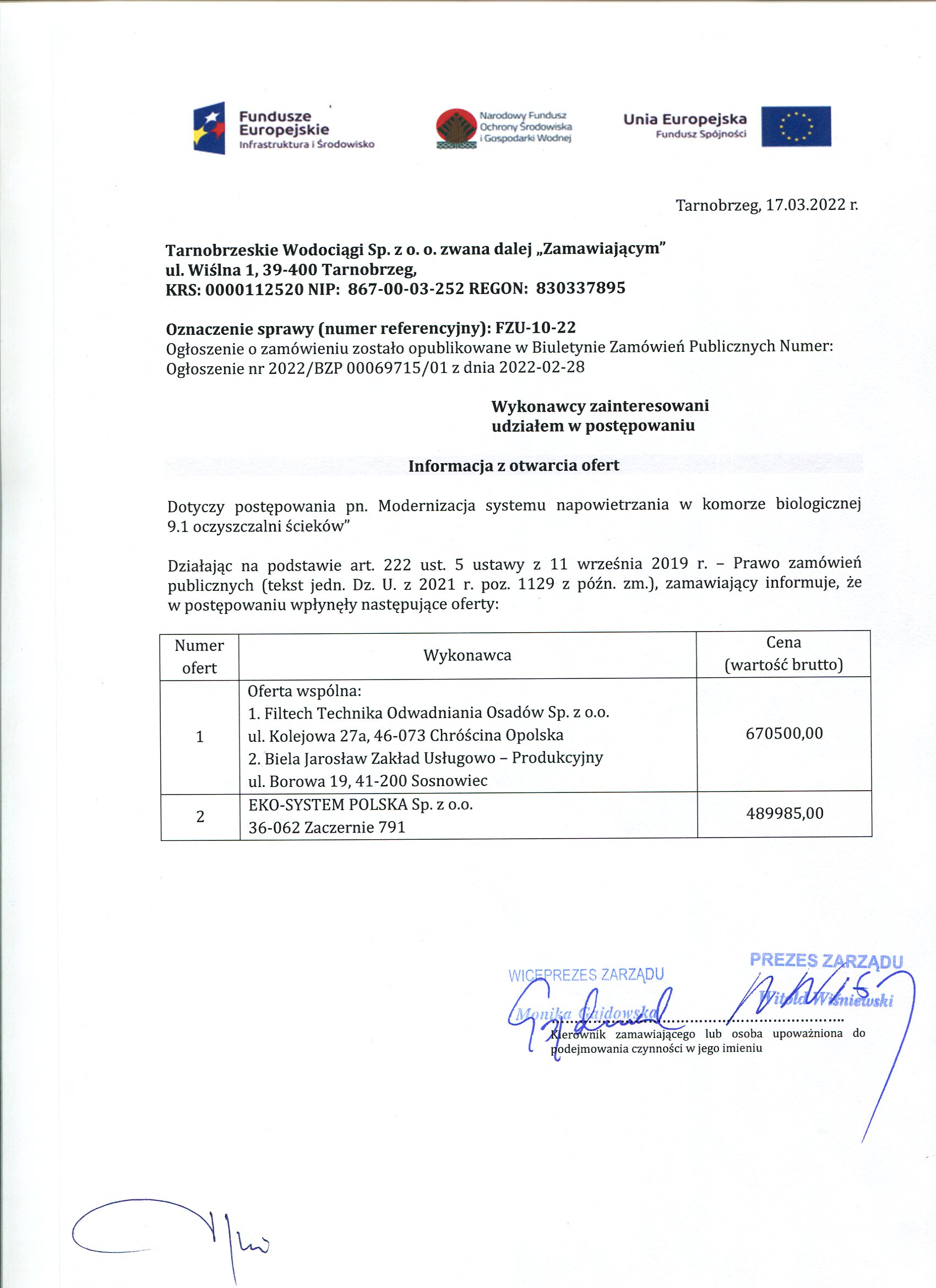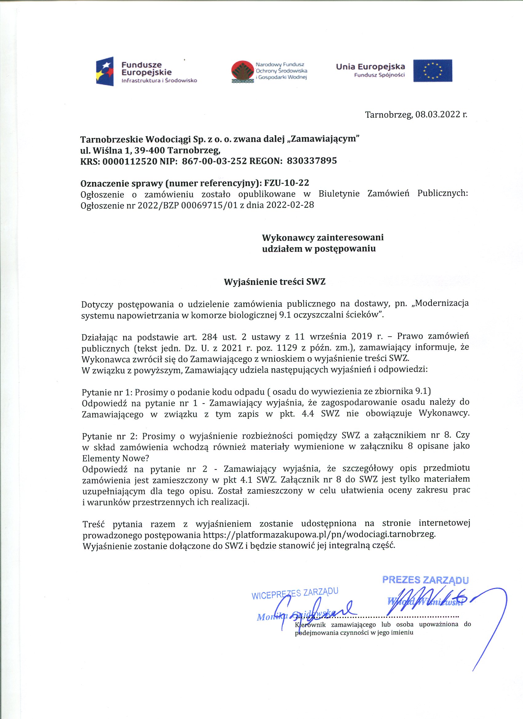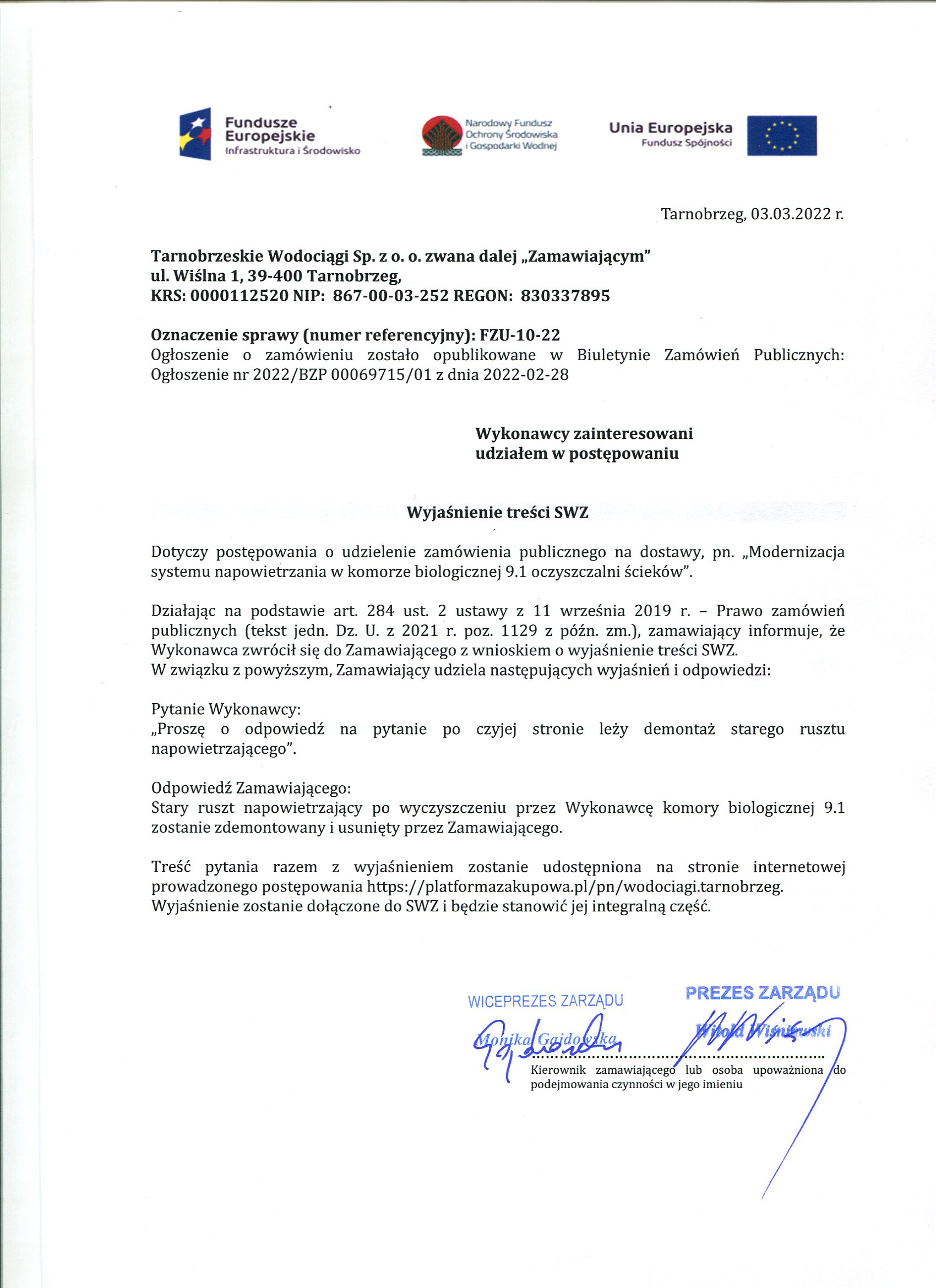 FZU-10-22Przetarg z dnia 28 lutego 2022 roku na: Modernizacja systemu napowietrzania w komorze biologicznej 9.1 oczyszczalni ścieków