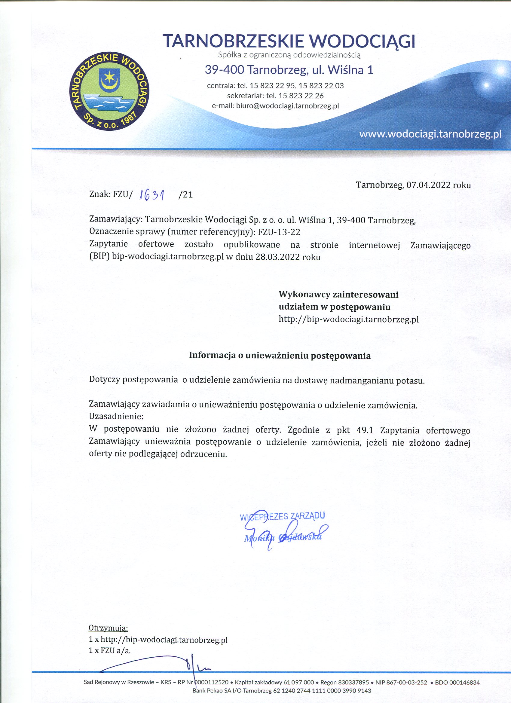 - Informacja o unieważnieniu postępowania: FZU-13-22 Informacja o unieważnieniu postępowania