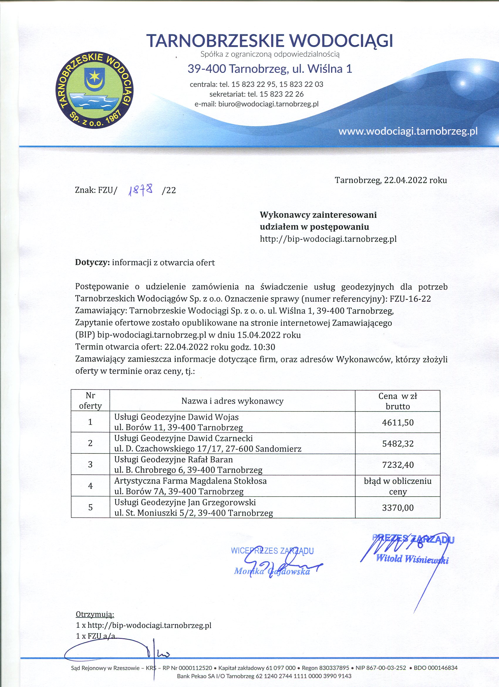 - Informacja z otwarcia ofert: FZU-16-22 Informacja z otwarcia ofert
