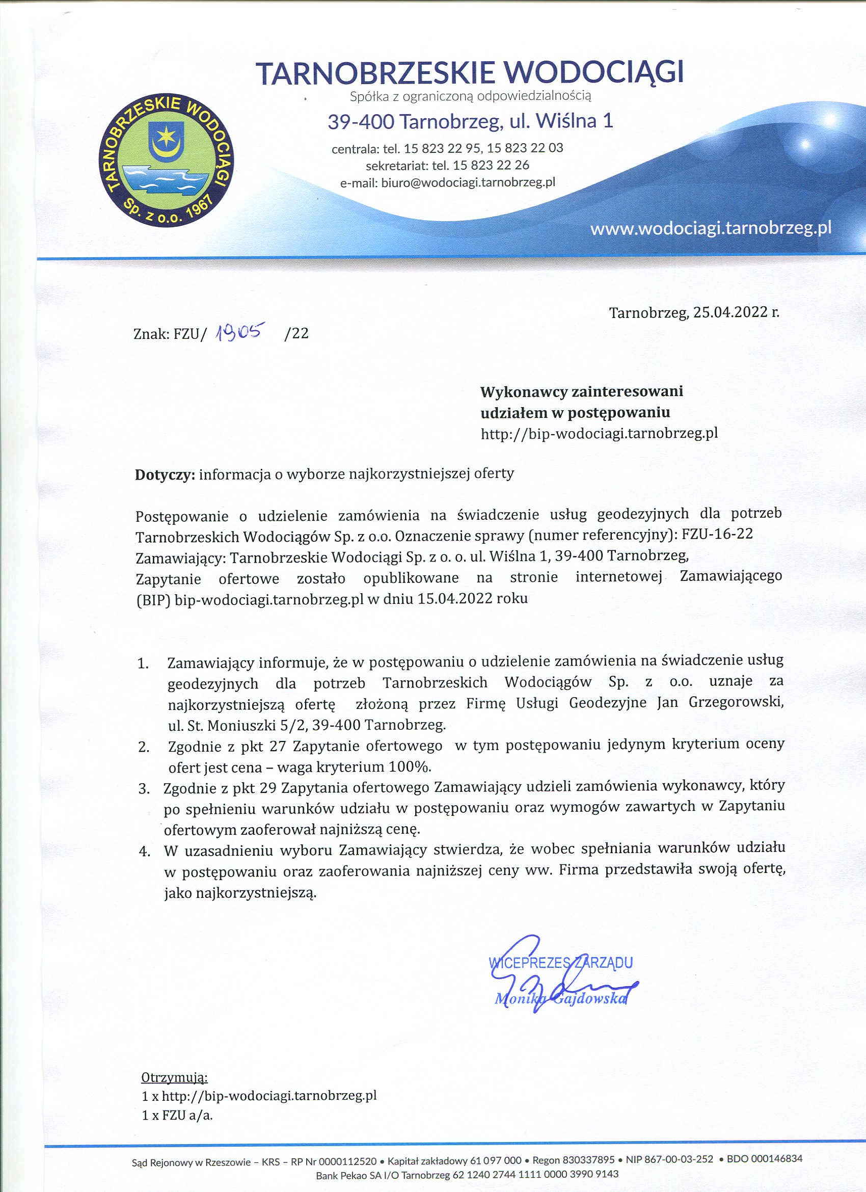 - Wybór najkorzystniejszej oferty: FZU-16-22 Informacja o wyborze najkorzystniejszej oferty