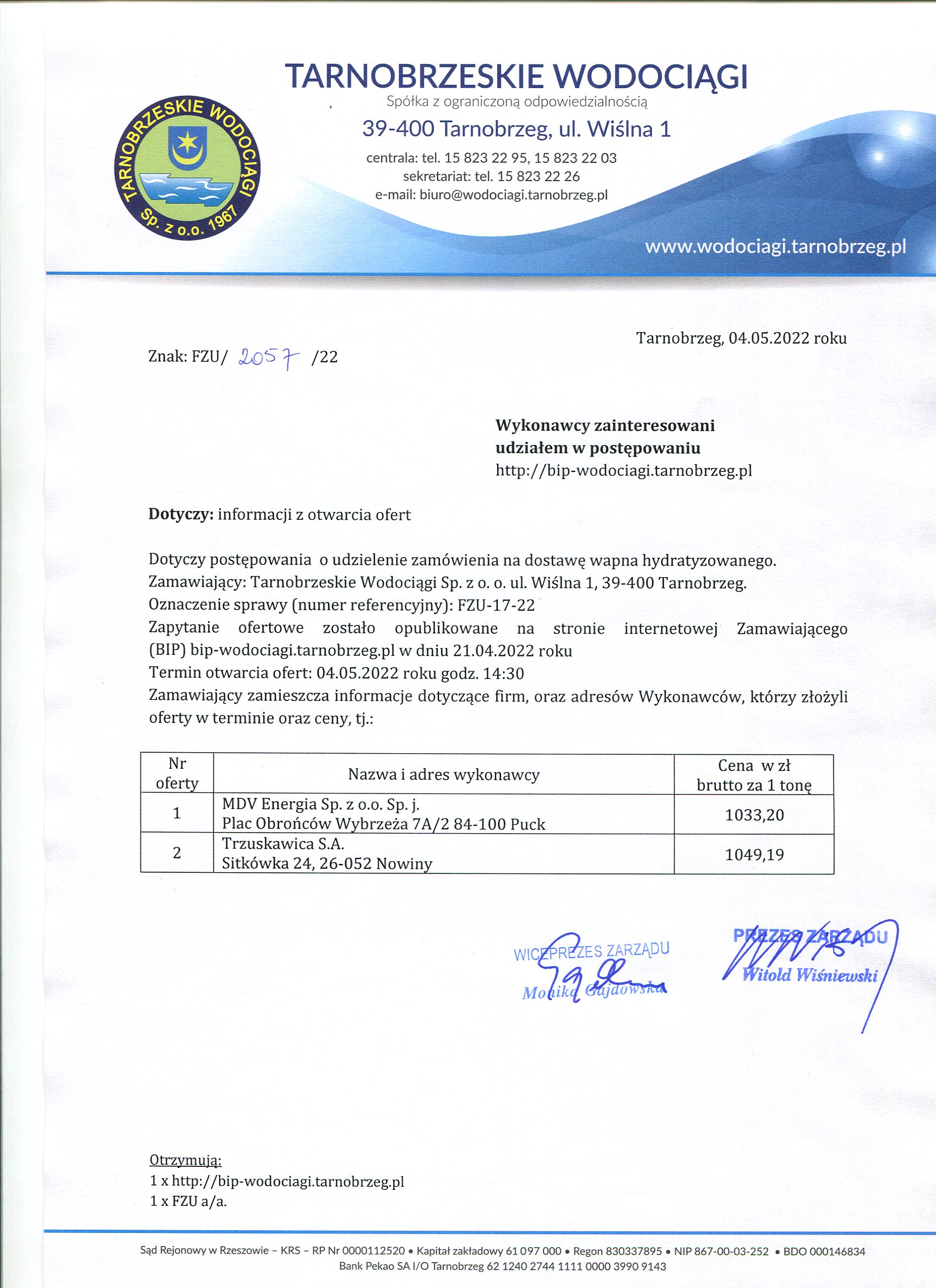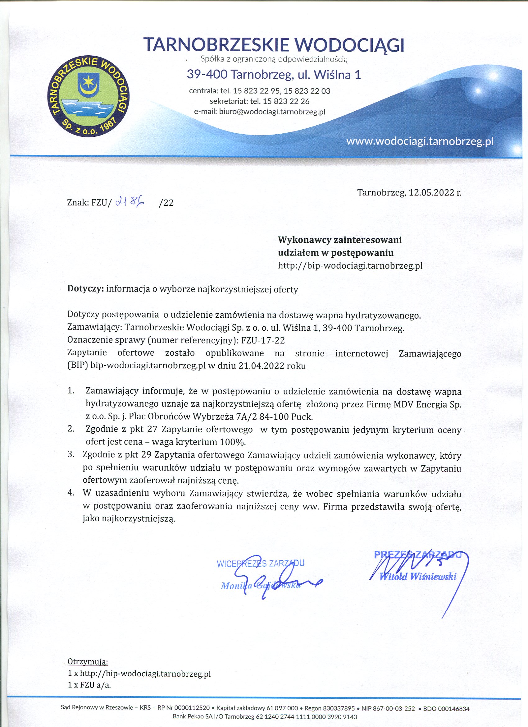 Zapytanie ofertowe z dnia 21 kwietnia 2022 roku na: Dostawa wapna hydratyzowanego