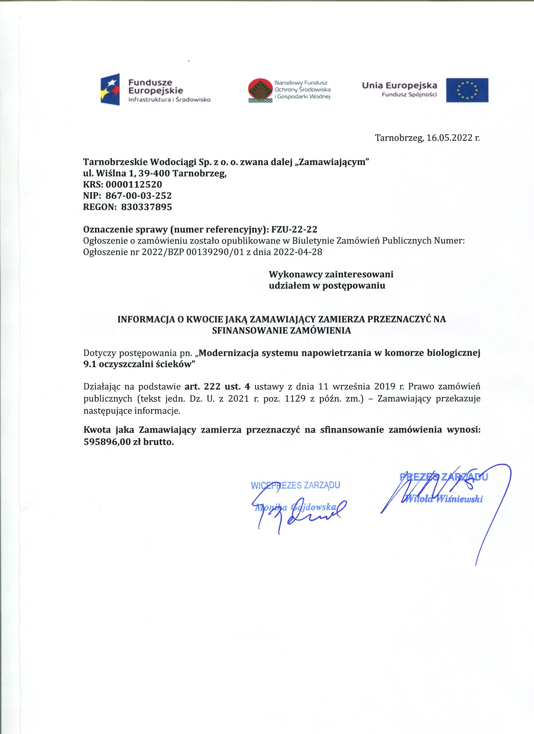 - Informacja o kwocie zamówienia: FZU-22-22 Informacja o kwocie zamówienia