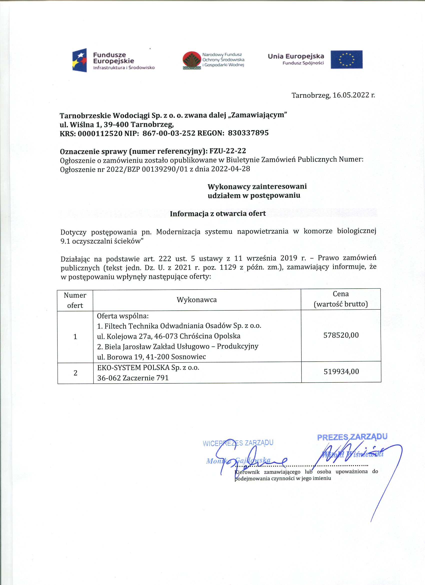 - Informacja z otwarcia ofert: FZU-22-22 Informacja z otwarcia ofert