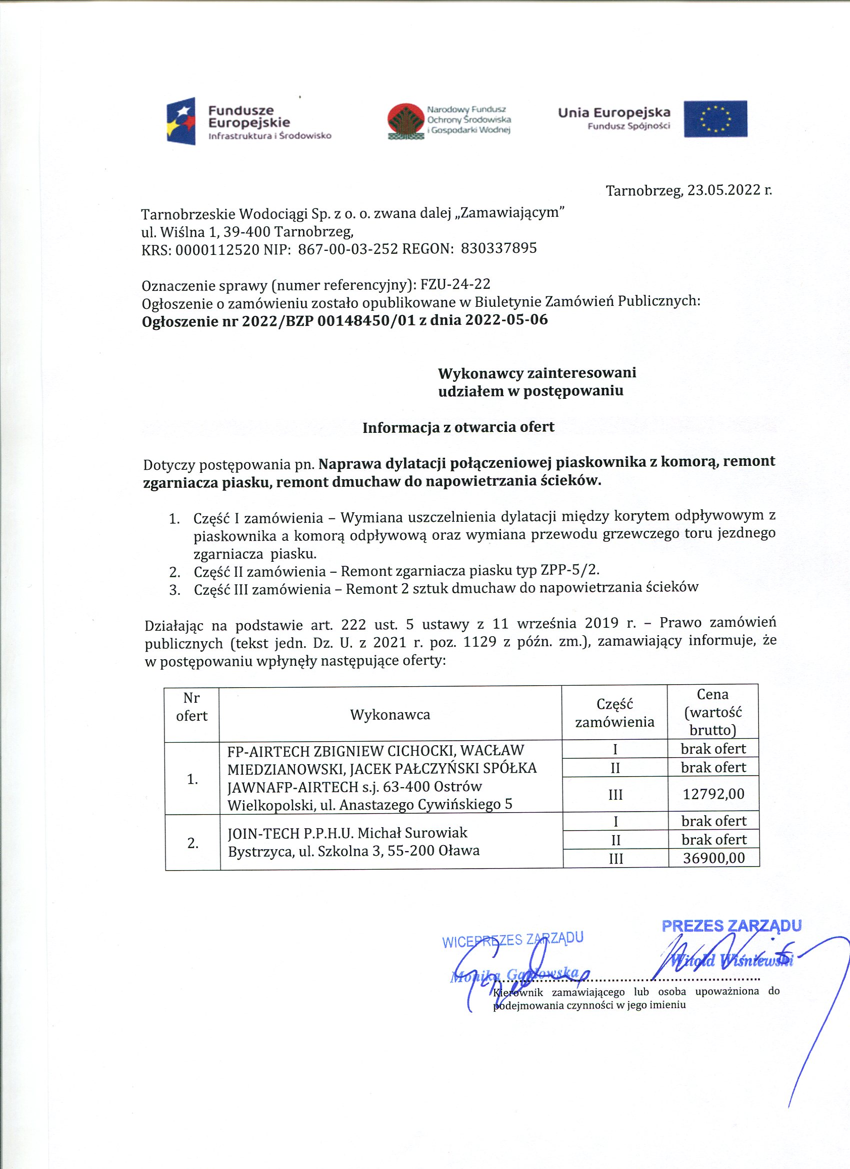 - Informacja z otwarcia ofert: FZU-24-22 Informacja z otwarcia ofert