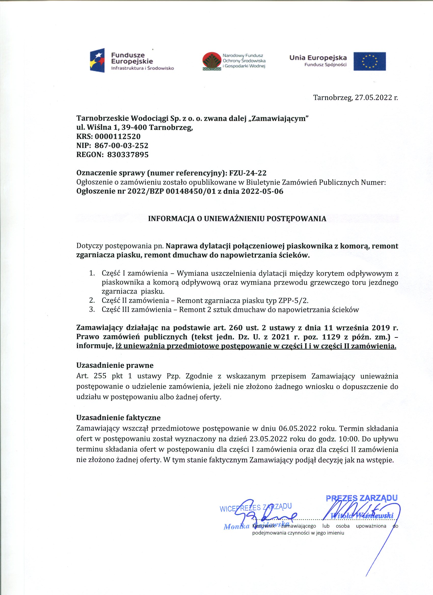 informacja o unieważnieniu postępowania: FZU-24-22 Informacja o unieważnieniu postępowania