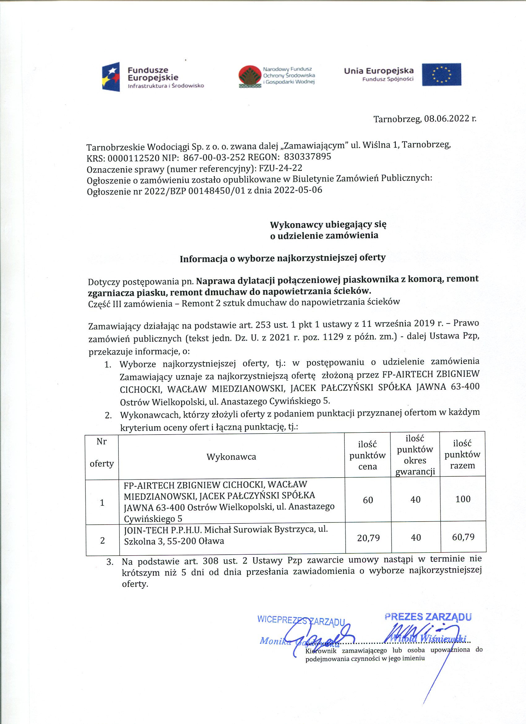 - informacja o wyborze najkorzystniejszej oferty: FZU-24-22 Wybór najkorzystniejszej oferty