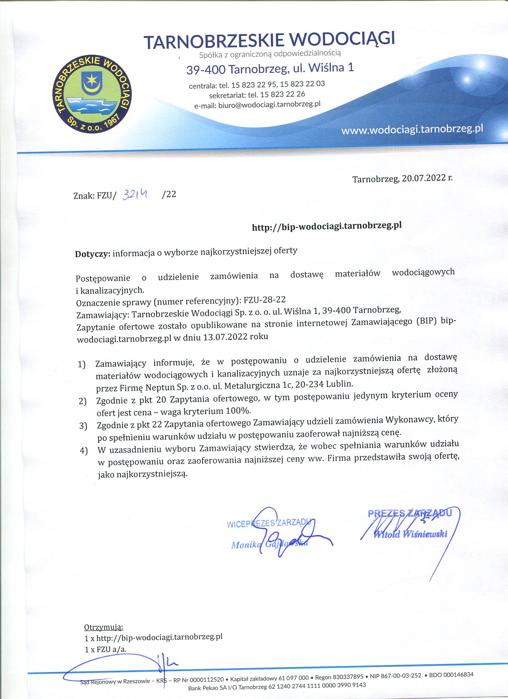 Zapytanie ofertowe z dnia 13 lipca 2022 roku na: Dostawa materiałów wodno - kanalizacyjnych