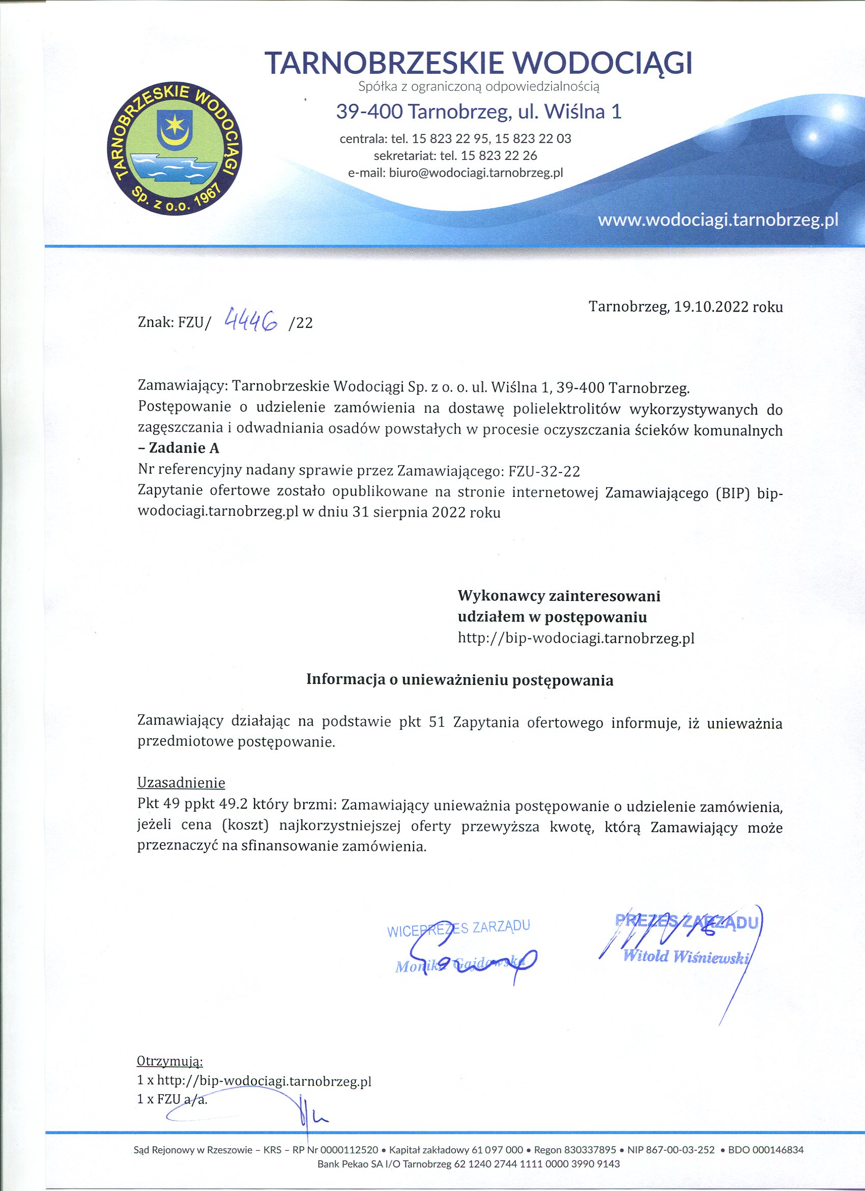 - Informacja o unieważnieniu postępowania: FZU-32-22 Informacja o unieważnieniu postępowania na Zadanie A