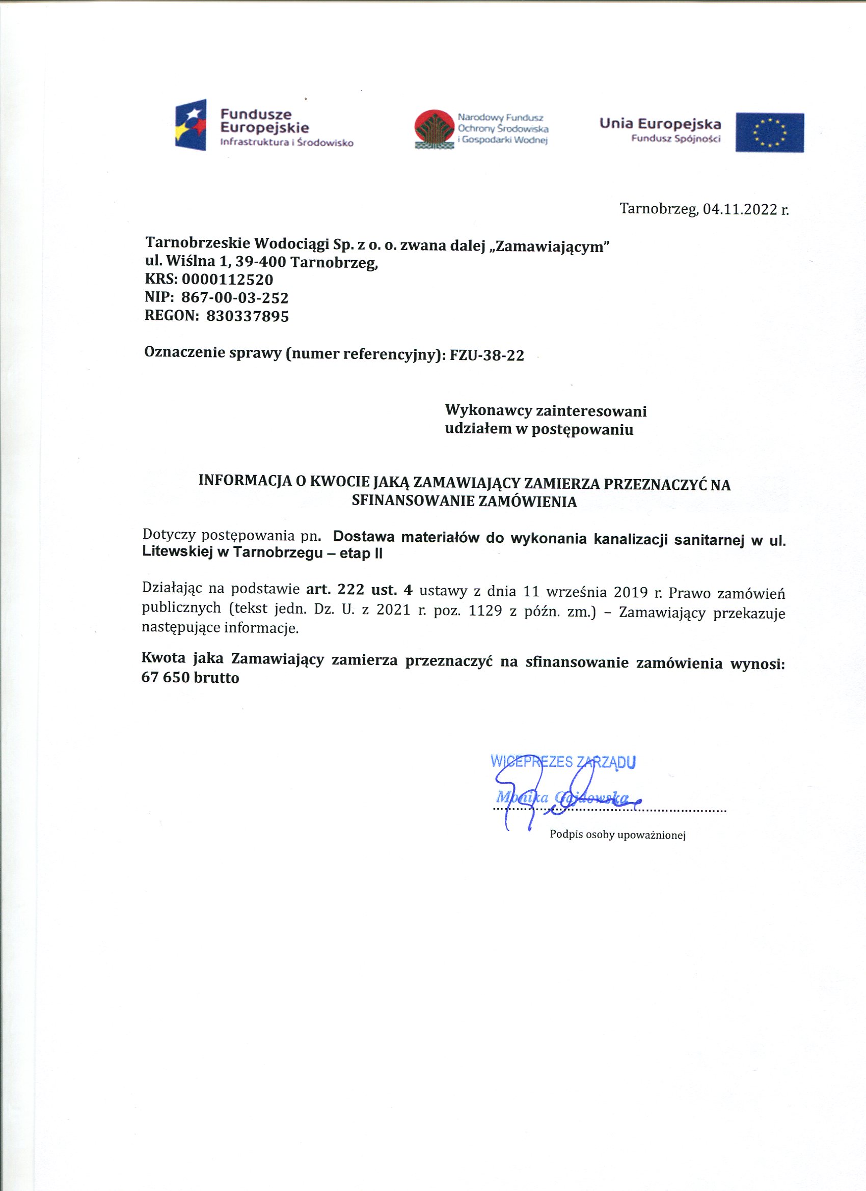 Przetarg z dnia 21 października 2022 roku na: FZU-38-22 Dostawa materiałów do wykonania kanalizacji sanitarnej w ul. Litewskiej w Tarnobrzegu
