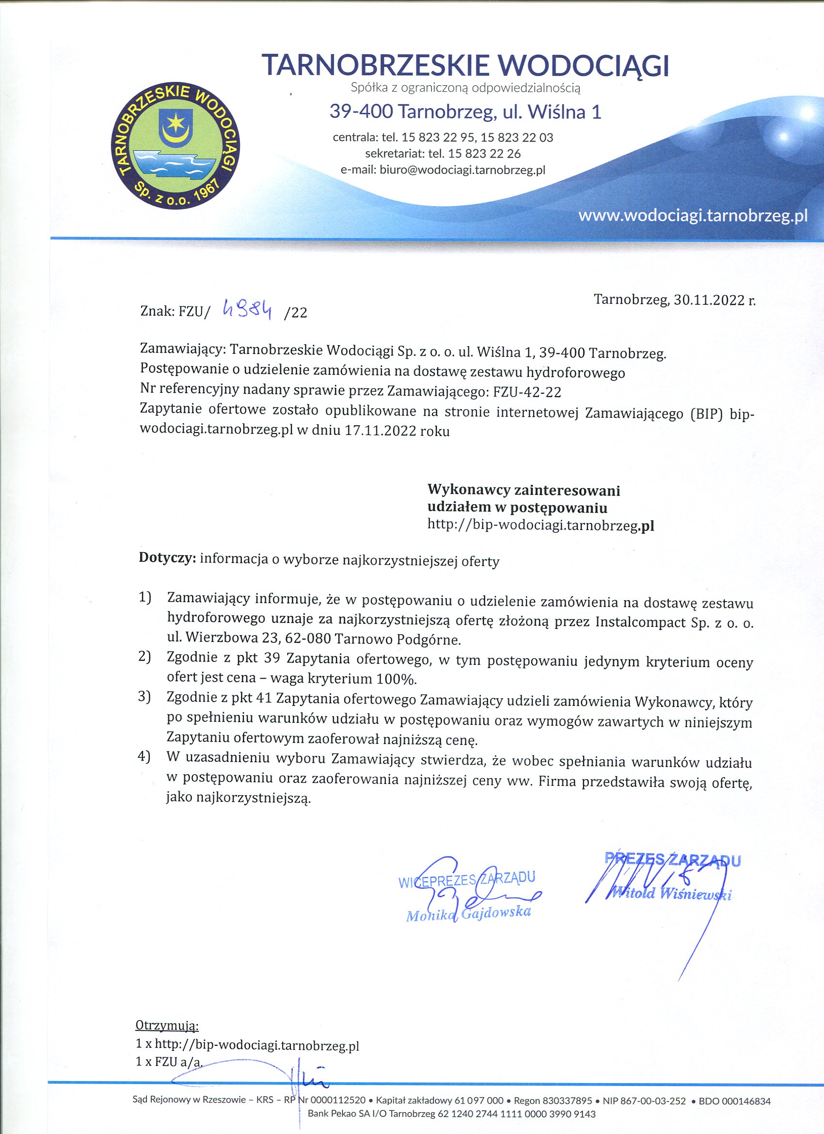 - Informacja o wyborze oferty: FZU-42-22 Informacja o wyborze oferty