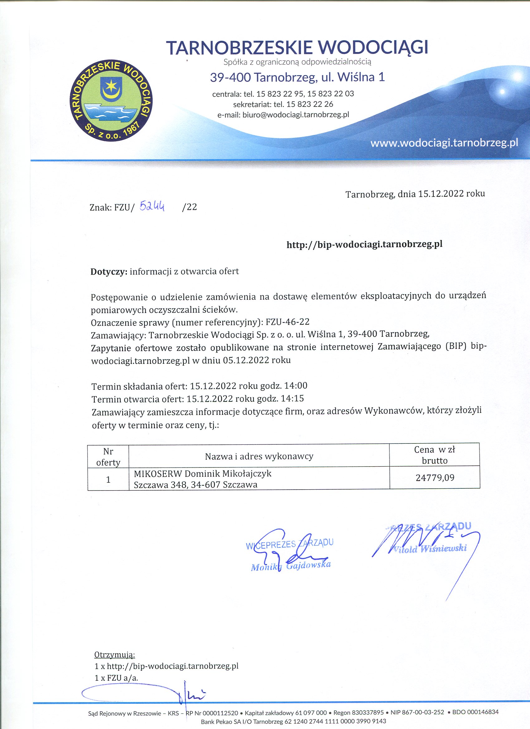 Zapytanie ofertowe z dnia 5 grudnia 2022 roku na:Dostawa elementów eksploatacyjnych do urządzeń pomiarowych oczyszczalni ścieków
