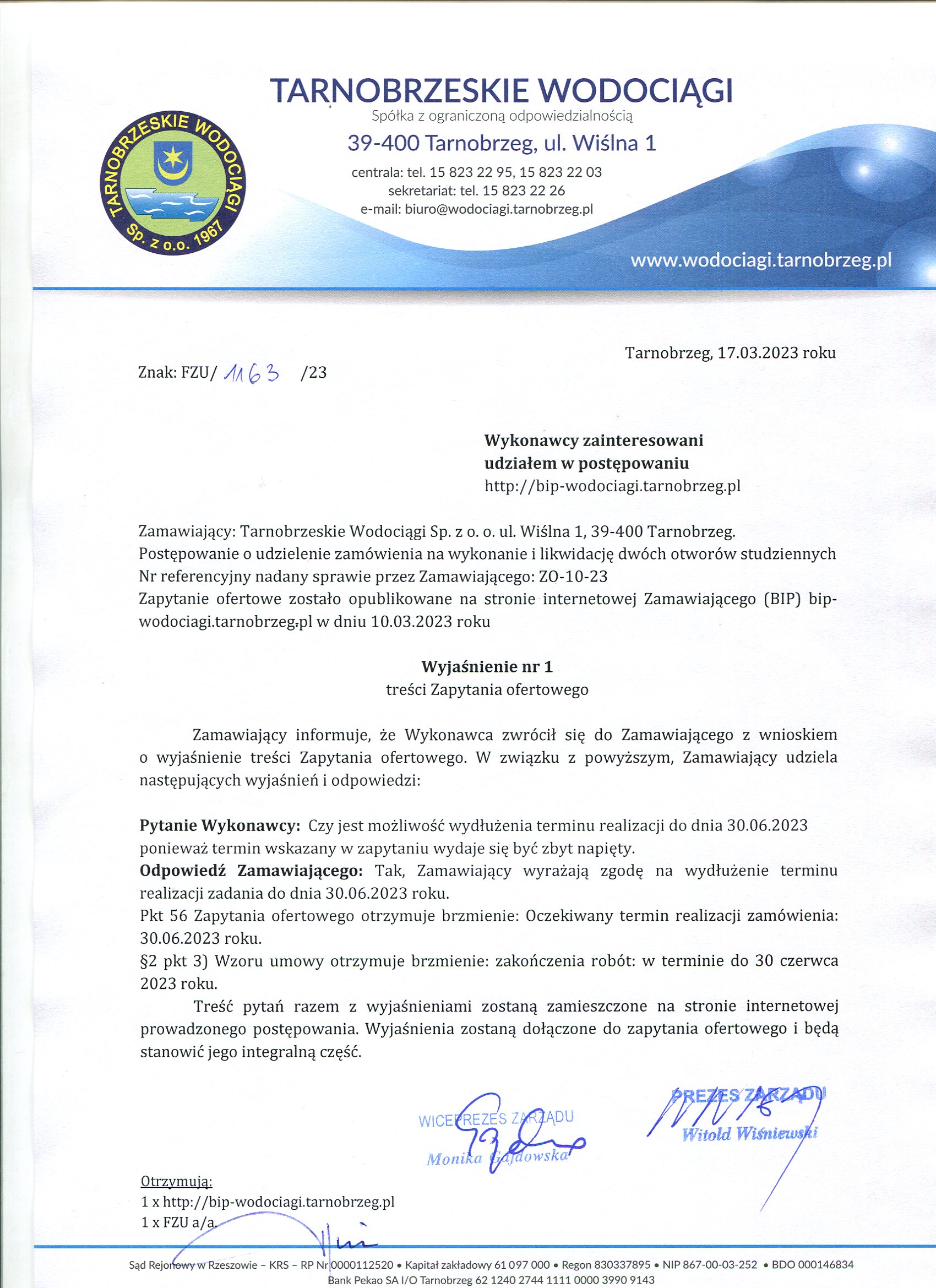 Zapytanie ofertowe z dnia 10 marca 2023 roku na: Wykonanie i likwidację dwóch otworów studziennych