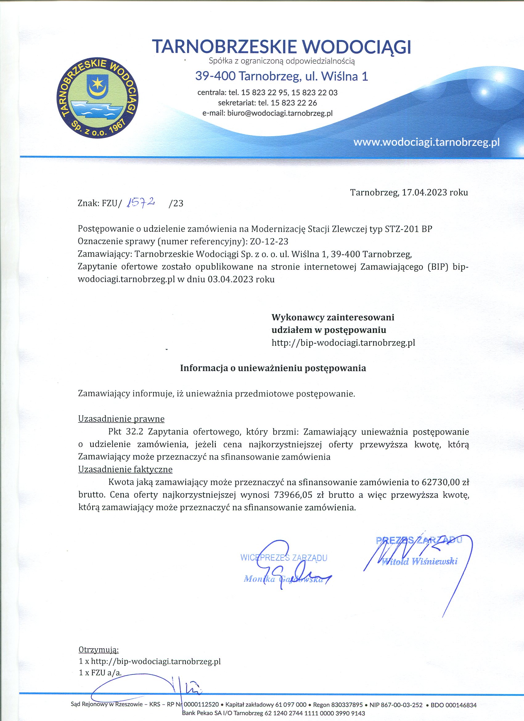 - Informacja o unieważnieniu postępowania: ZO-12-23 Informacja o unieważnieniu postępowania