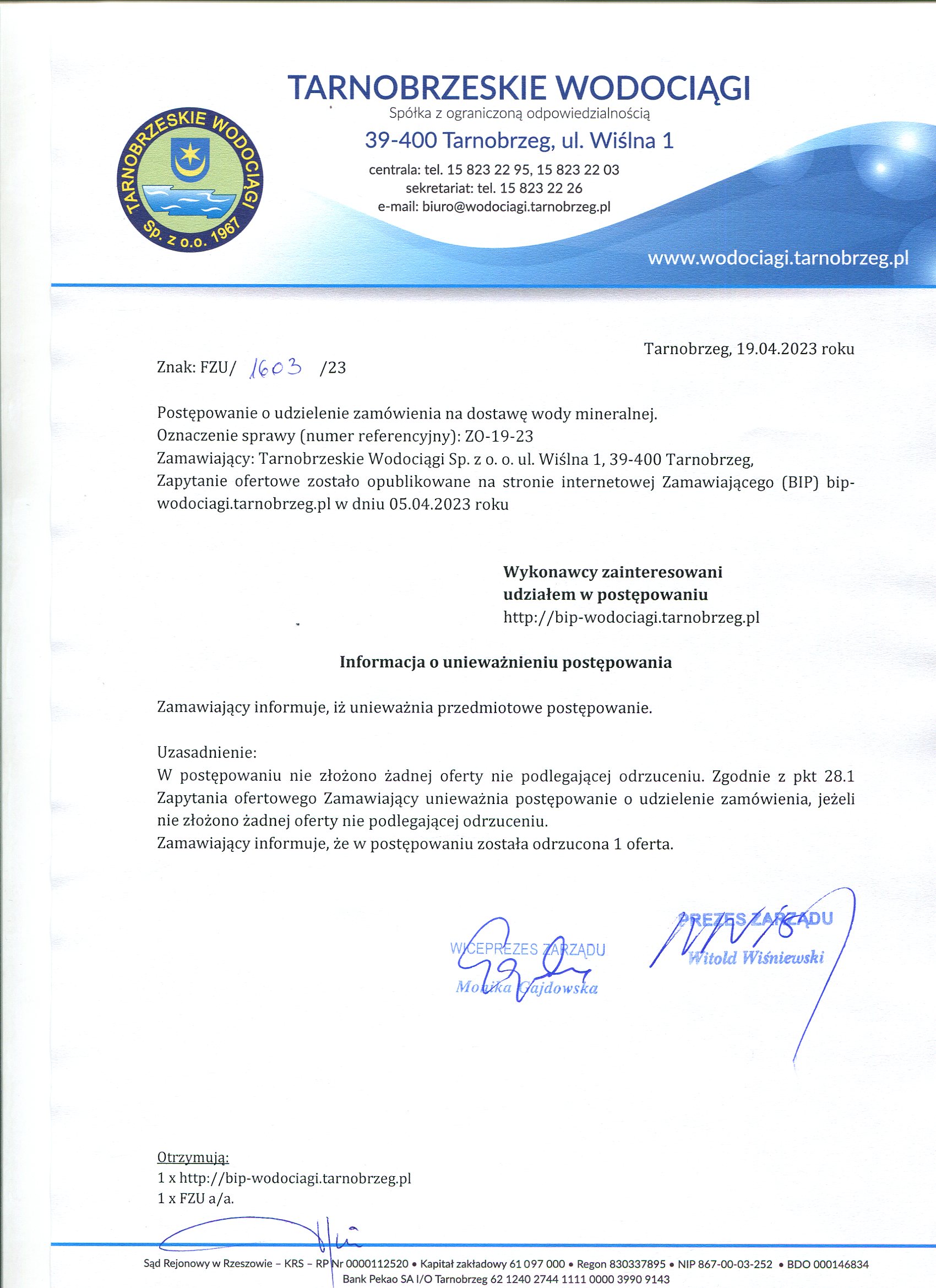 - unieważnienie postepowania: ZO-19-23 Informacja o unieważnieniu postepowania