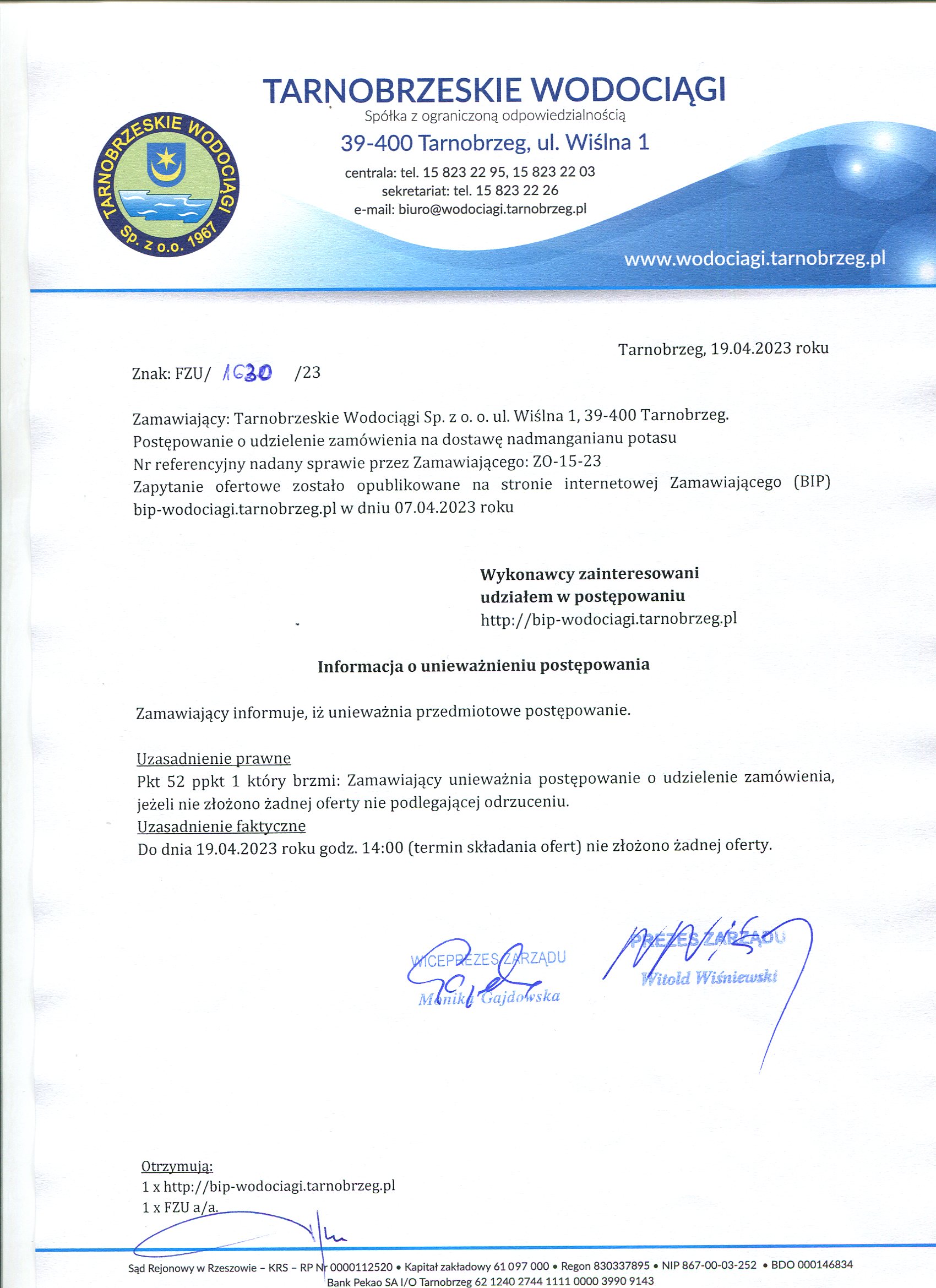 - Informacja o unieważnieniu postępowania: ZO-15-23 Informacja o unieważnieniu postępowania