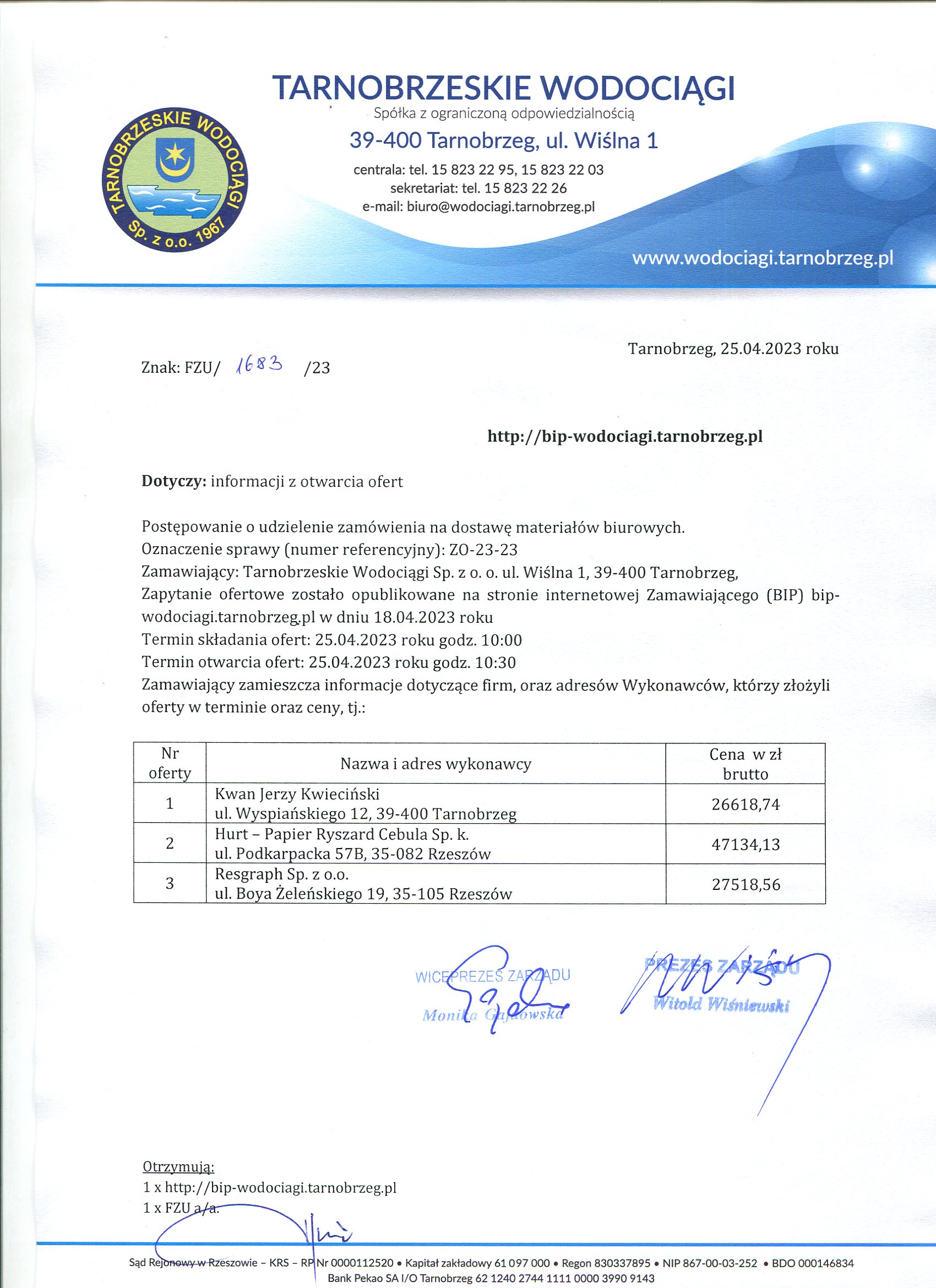 - Informacja z otwarcia ofert: ZO-23-23 Informacja z otwarcia ofert