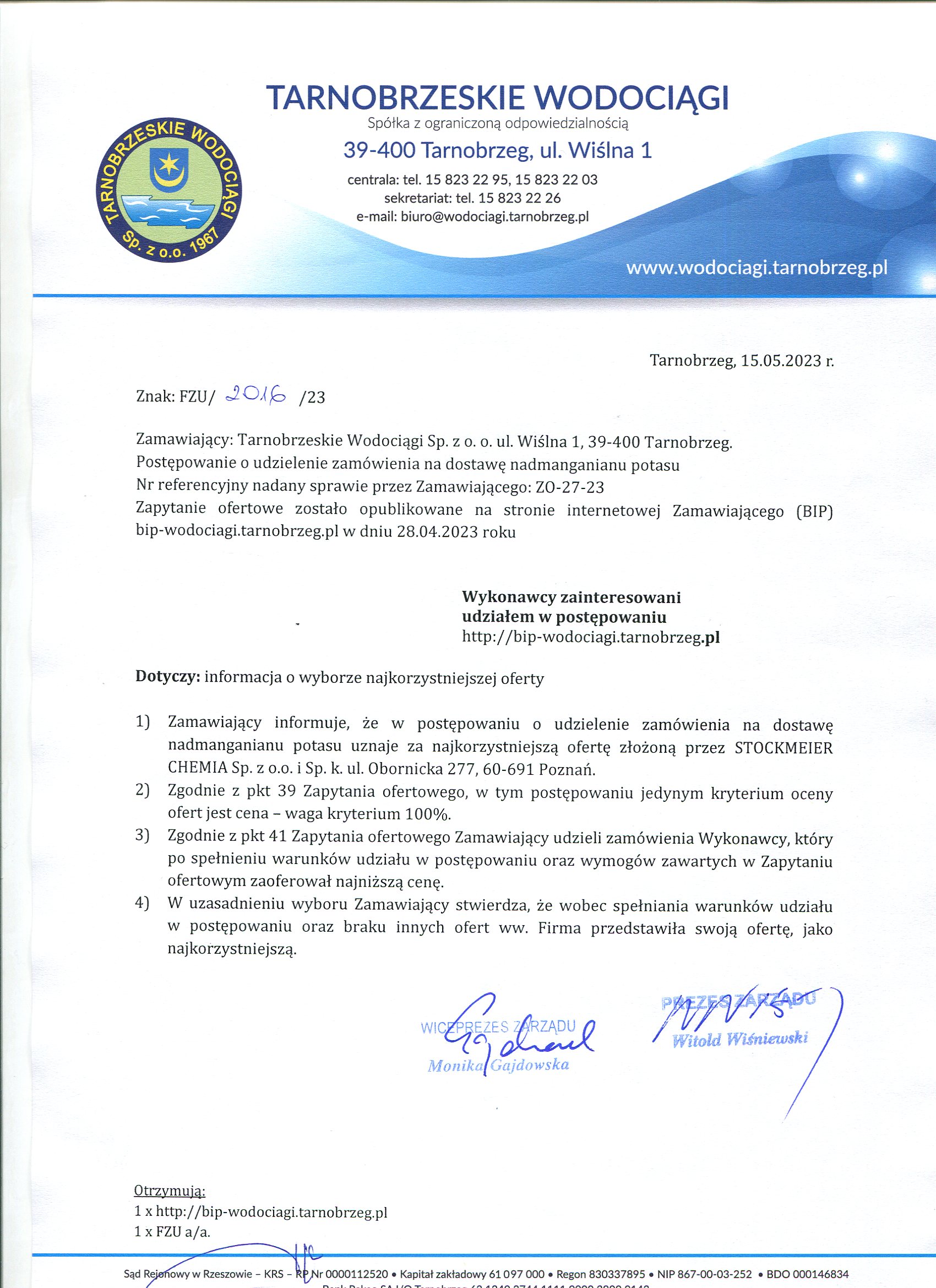 Zapytanie ofertowe z dnia 26 kwietnia 2023 roku na: Dostawa Nadmanganianu Potasu. Oznaczenie sprawy: ZO-27-23